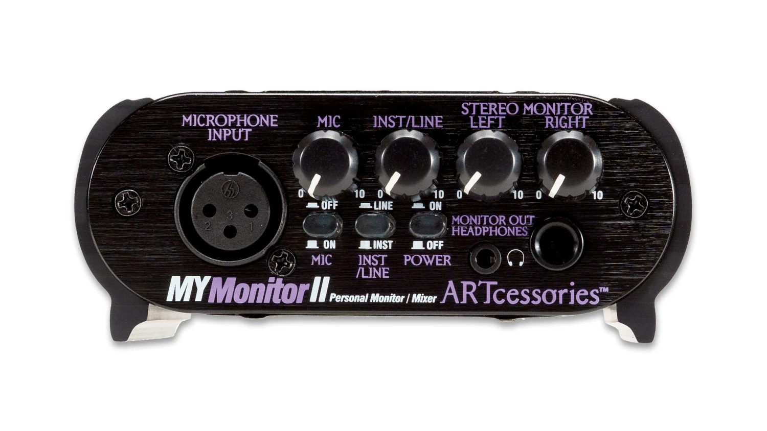 The MYMonitorII allows blending of any microphone source with any stereo source in a convenient personal monitoring solution. The microphone thru provides direct connection to any mixer and will pass phantom power from the board for powering condenser microphones.