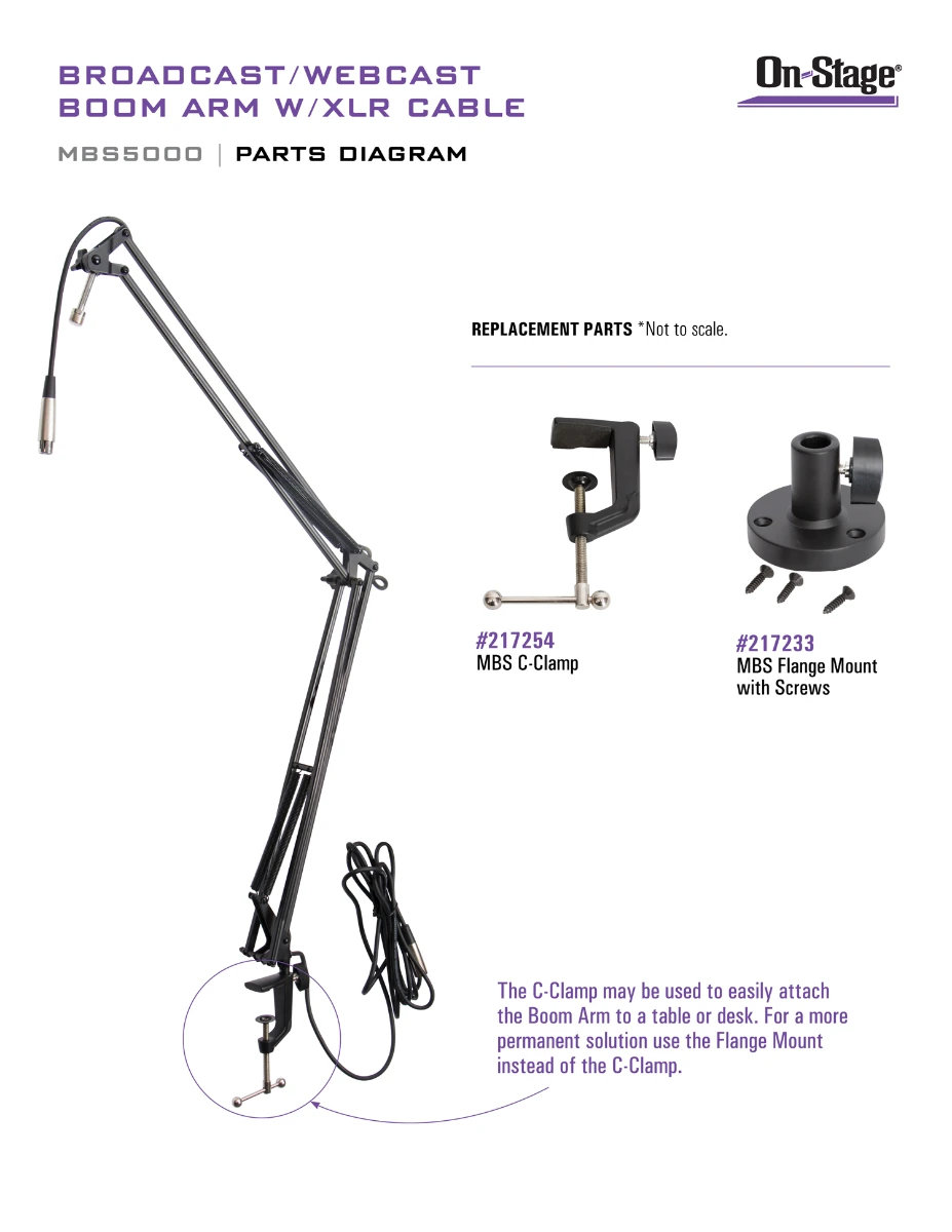 MBS5000 Broadcast Mic Boom Arm is a reliable articulating mic boom for broadcast and webcast that provides quiet, easy positioning even while on air. Heavy-duty construction ensures strength and durability while two pairs of springs provide appropriate counterbalance for popular broadcast mics and oversized shock mounts. The pre-installed internal XLR cable simplifies cable management and declutters your studio. Installation is easy with a choice of a removable C-clamp for desktops or a screw-in flange mount for any flat surface.
