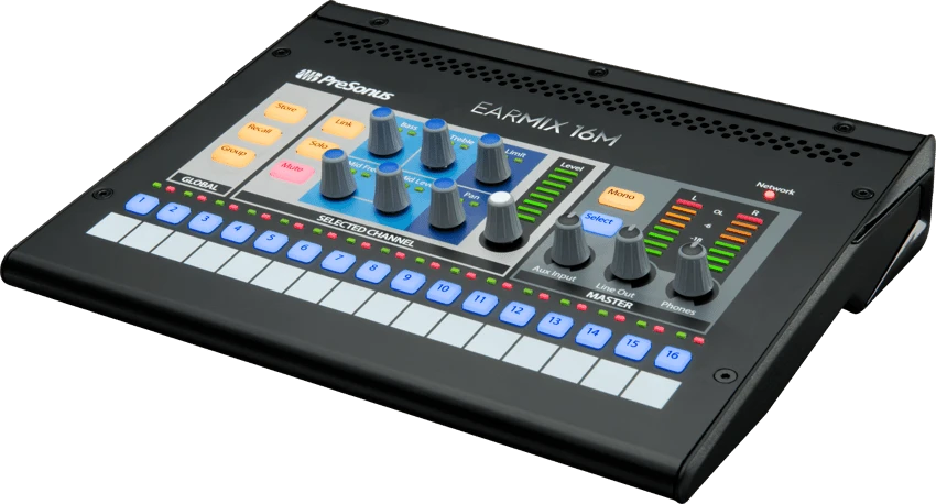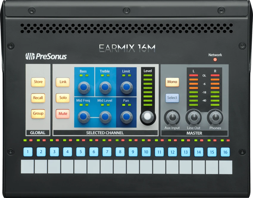 Designed to work seamlessly with PreSonus’ StudioLive Series III family of mixers, yet compatible with other AVB-enabled systems, the PreSonus EarMixâ„¢ 16M personal monitor mixer accepts 16 mono channels of input via AVB networking. An aux input admits an external source to the local mix. You get stereo channel linking and channel grouping, along with three-band EQ and limiting for each channel and the main mix, balanced ¼-inch TRS L/R outputs, and a loud, clear headphone amplifier that can drive low impedance devices such as high quality in-ear-monitors. Two AVB jacks enable daisy chaining; network up to 24 units with a StudioLive Series III mixer. The EarMix 16M can be powered from the included external power supply or over Ethernet (PoE) from a compatible switch.