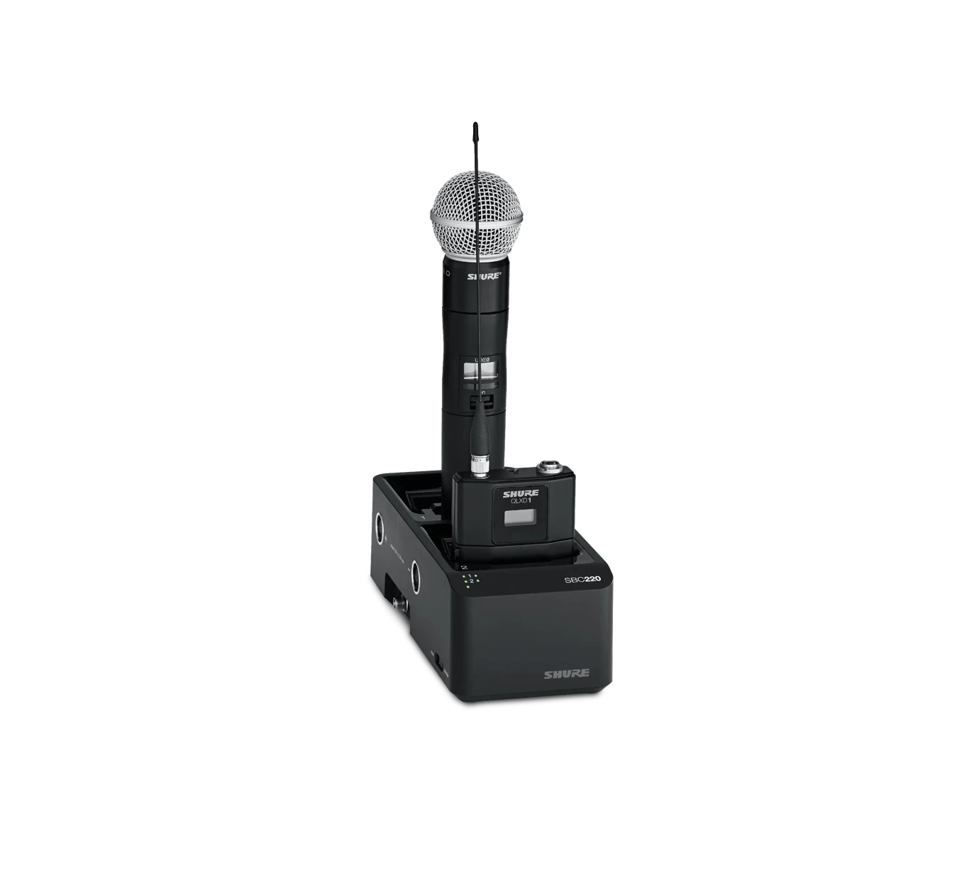 The SBC220 2-Bay Networked Charging Station enables docked charging and storage for any combination of two sb900b batteries or ULXD1, QLXD1, AD1 (bodypack) or ULXD2, QLXD2 or AD2 (handheld) wireless transmitters. When the connected to a network, the charging status of each transmitter can be viewed remotely, and up to four SBC220 units can be linked together using shared power and network connectivity