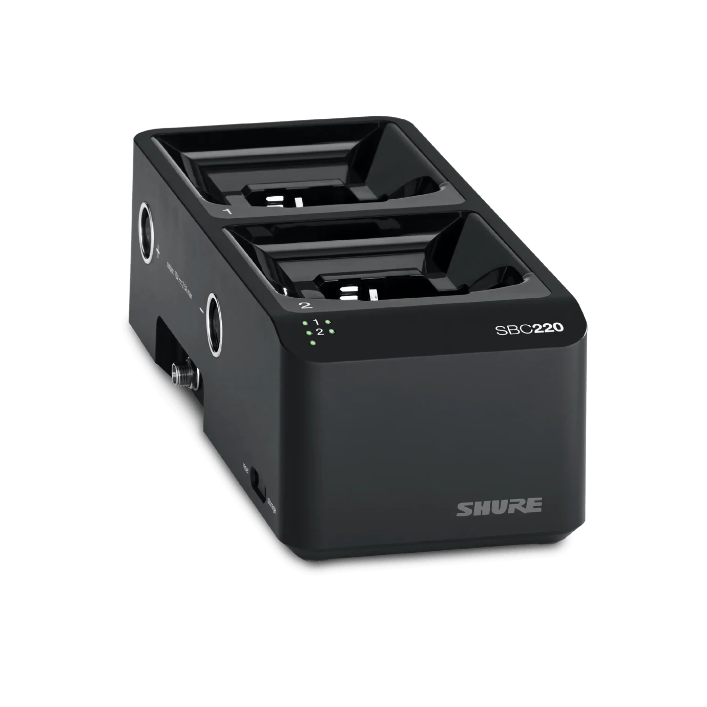 - Charging for any combination of up to 2 supported batteries, or transmitters using Shure rechargeable batteries