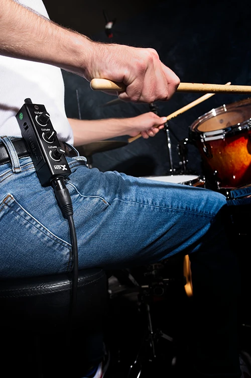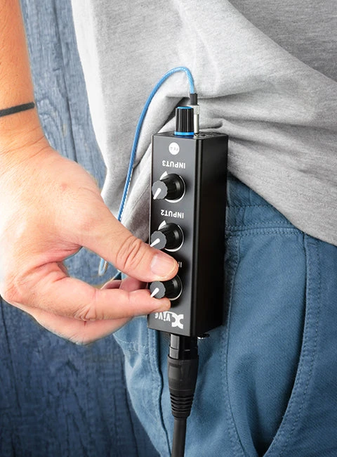 The PX-A 3-Channel Mixer and Headphone Amplifier is a beltpack unit that accepts three audio signals, lets you mix them however you like, and passes on the mixed signal to your in-ear monitors, earphones or headphones.
